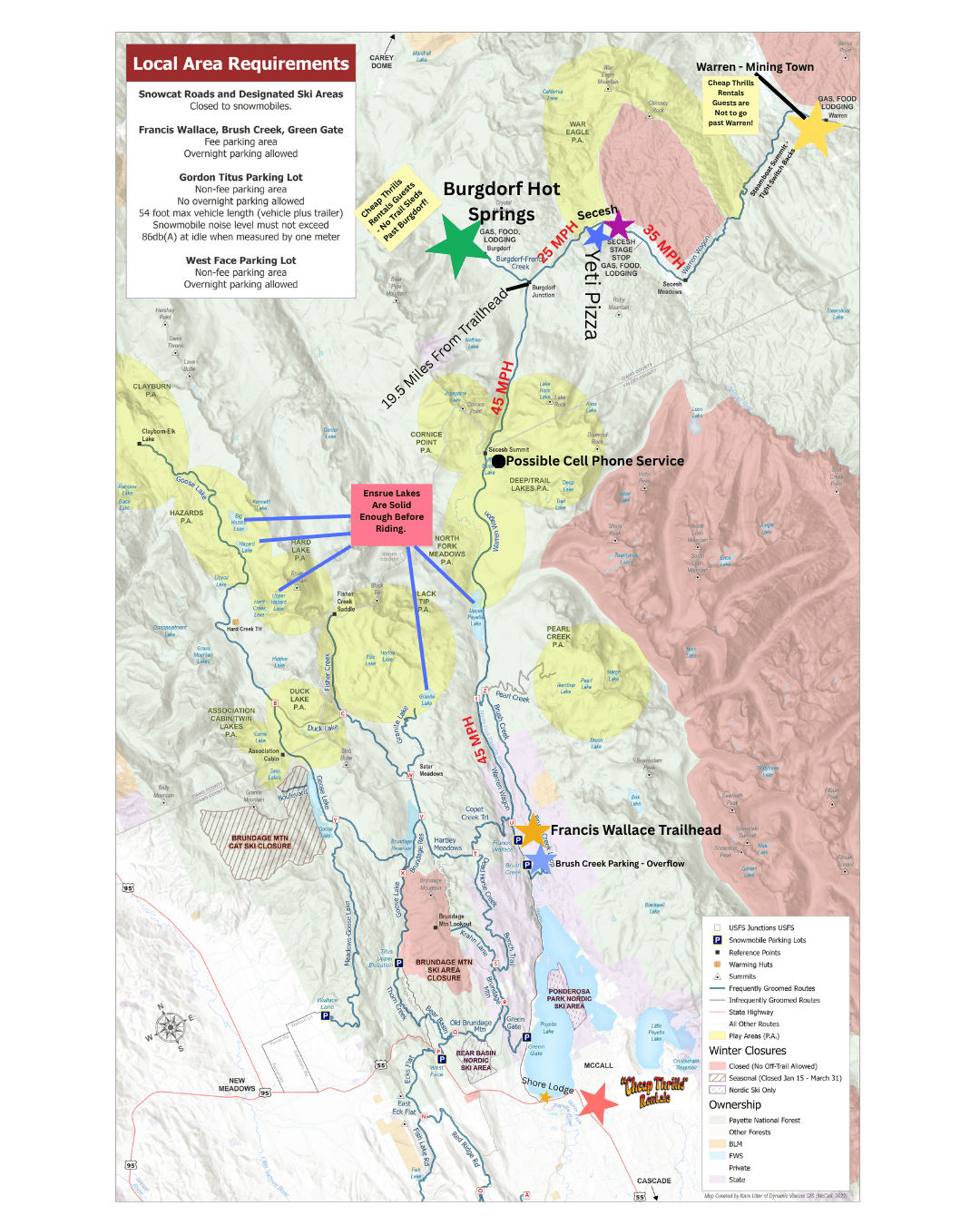 Limited Overnight Parking will be available in Francis Wallace Trailhead in Designated Area. Overflow will have to Park in Brush Creek. Please Note That We Do Not Allow Rental Sleds to go to Brush Creek Parking Lot As It Will Ruin Our Tracks & Pack Sleds. You will need to bring Cash to pay the $10 per day parking fee. We do not get passes this year to give to our guests. It's a $50 per day fine for not paying issued by Valley County Sheriff's Department.